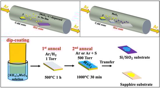 Moreover, the TD-based CVD method presents an alternative approach to produce highly crystalline MoS2 thin layers with superior electrical properties on insulating substrates [34]. Typically, the TD-CVD is based on the high-temperature annealing of a thermally decomposed ammonium thiomolybdate layer (NH4)2MoS4 in the presence of S, as illustrated in Figure 2c. It is worth noting that the excess in sulfur introduces changes in the shape, size, and morphology of fabricated MoS2. It also leads to a p-type MoS2 semiconductor by increasing the electrons deficiency. In contrast, the presence of sulfur vacancies in MoS2 was reported to have a direct impact on the catalytic properties of MoS2, suggesting a carriers’ mobility alteration [80]