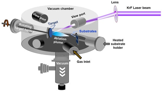 Pulsed laser deposition (PLD) has emerged as one of the most promising physical vapor deposition (PVD) techniques for the deposition of MoS2 thin films. The PLD approach consists of shining a focused high-power laser beam onto the surface of a solid target to be ablated and deposited as a film on a substrate. PLD is a non-equilibrium process that leads to the absorption of very-short (15–20 ns) and highly-energetic laser pulses by the target and to the formation of a directive plasma plume. The laser-ablated species that form the plasma plume condense onto the substrate, leading to the growth of a thin film. The PLD is well known for its large process latitude, high-flexibility, and excellent process controllability. For instance, by controlling the number of laser ablation pulses and/or the background gas pressure, nanoparticles, and/or films with thicknesses varying from few nm to few microns can be synthesized. Figure 3 shows a schematic representation of a PLD system.