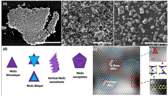 Furthermore, MoS2 layered materials were observed to exhibit various shapes and morphologies, such as planar [34,35,36] and vertically aligned nanosheets (NSs) [37], nanoflowers [38], nanotubes [39], nanowires [40], and nanoplatelets [41,42]. This variety of forms could be controlled by choosing suitable synthesis routes with optimized operating parameters [38,39,40,41,43,44,45,46,47]. Thus, it is possible to adjust the 2D-MoS2 properties to develop high performance devices i energy storage [47], electronics [46], photonics [45], sensing [48], and field emission [49] applications. Recently, up to few-layer MoS2 nanosheets have been shown to be highly efficient for electronic, optoelectronic, and solar energy harvesting devices [50,51,52] because of their tunable direct bandgap [53], strong light-absorption, and prominent photoluminescence with energies lying in the visible range (1.8–1.9 eV) [54].