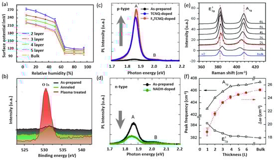 (a) Surface potential captured by KPFM vs. relative humidity RHs with respect of the number of MoS2 layers (reproduced and adapted from Ref. [133], Copyright 2017, IOP Publishing); (b) XPS spectra of Mo 3d and S 2s core levels for different treatment conditions (adapted from Ref. [132] Copyright 2014, American Chemical Society); (c,d) PL spectra of monolayer MoS2 before and after being doped (reproduced from Ref. [134] Copyright 2013, American Chemical Society); and (e,f) Raman spectra for various MoS2 films with respect to the number of MoS2 layers (reproduced from Ref. [135] Copyright 2010, American Chemical Society).