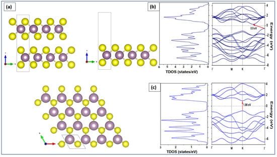 To obtain the electronic properties, the MoS2 bulk was considered as a set of two hexagonal planes linked together by weak Van Der Waals bonds. The MoS2 monolayer was considered as a single hexagonal plane with covalent bonds between atoms S-Mo-S [142]. The left panel of Figure 6b shows the total DOS calculation results of the bulk MoS2 while the right panel of Figure 6b shows the calculation of its band structure. The energy range is between −8 and 4 eV versus the directions of the highest symmetries in the first Brillouin zone Γ, M, K, and Γ. As observed from the band structure calculations, the MoS2 bulk has an indirect bandgap of 0.9 eV. The minimum of the conduction band is located between K and G and the maximum of valence band at point G. This indirect bandgap obtained for the MoS2 bulk was attributed to the presence of interlayer interactions in the bulk structure [143]. In contrast, Figure 6c shows that the monolayer MoS2 has a direct bandgap of 1.89 eV at the K point. The DOS results are compatible with the results of the band structure. Similar conclusions have been stated in other investigations [141,142].