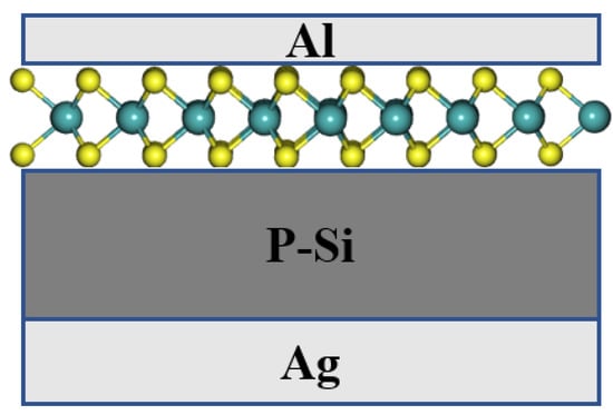 To highlight the electrical performance of thin films MoS2-based solar cells in a homojunction form, we used the one-dimensional solar cell capacitance simulator SCAPS-1D™ software 3.3.08 interface [154], developed by M. Burgelman – Department of Electronics and Information Systems at the University of Ghent, Belgium [155,156], to calculate the different PV parameters, i.e., open circuit voltage VOC, short-circuit current density JSC, fill factor FF, and PCE (η). In this sense, a solar cell made of Ag/p-Si/MoS2/Al structure, as the one represented by a schematic in Figure 7, was implemented in the SCAPS-3308™ environment.