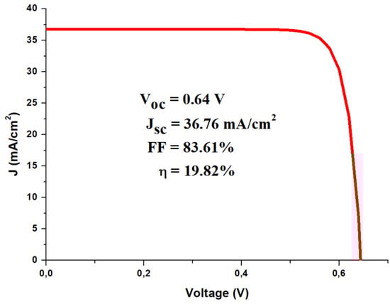 The simulations were made under AM1.5 illumination conditions at an operating temperature of 300 K. The physical parameters related to the electronic properties of the layers used in the simulation are shown in Table 7. For the considered junction, the thermal speed of the electrons and the holes were fixed at 107 cm/s, the type of defect is neutral, and the capture cross section is 10−14 cm2.