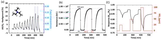 MoS2 thin films obtained by mechanical exfoliation were used for highly sensitive field-effect transistor (FET) sensors [147]. By varying the number of MoS2 layers, the MoS2-based FET sensor exhibited high nitrogen monoxide (NO) sensitivity with a detection limit of 0.8 ppm. Moreover, DFT calculations indicated that NO and NO2 seemed to strongly bind to MoS2 nanosheets in contrast to other molecules such as carbon monoxide (CO), carbon dioxide (CO2), NH3, NO, NO2, and CH4. In addition, the exfoliated MoS2 monolayer showed high response to triethylamine (TEA) at concentrations ranging from 1 to 100 ppm at room temperature (Figure 9a). Due to the strong response and excellent signal-to-noise ratio, a detection limit of TEA as low as 10 ppb was achieved.