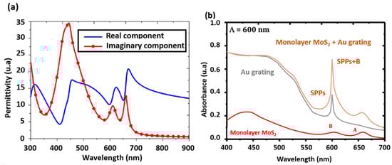 (a) Complex permittivity vs. wavelength of monolayer MoS2 (reproduced and adapted from [174], Copyright 2018, The Optical Society, OSA); and (b) spectral absorptances of an opaque Au plate, a simple 1D Au grating, a suspended monolayer MoS2, and monolayer MoS2-covered Au grating for TM waves with normal incidence from 400–700 nm (reproduced from Ref. [175] Copyright 2018, Elsevier).