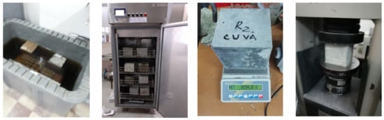 After 300 repeated freeze–thaw cycles, the specimens were tested for compression and the compressive strength losses were calculated, for the specimens tested with freeze–thaw cycles compared to the control specimens, with Equation (1) as follows: