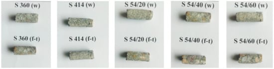 A longer relaxation time (Figure 9b) and a higher intensity (Figure 9b) in the S 54/60 mixture show an increase in the size and the proportion of capillary pores in the samples tested at freeze–thaw (f-t) compared to the control specimens kept in water (w).