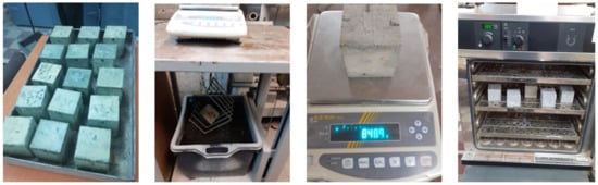 For each mixture, 8 cubic specimens with a side of 150 mm and 3 specimens with a side of 71 ± 1.5 mm, as shown in Table 4, were prepared and kept in the air for 24 h after which they were stripped and immersed in water at a temperature of 20 ± 2 °C.