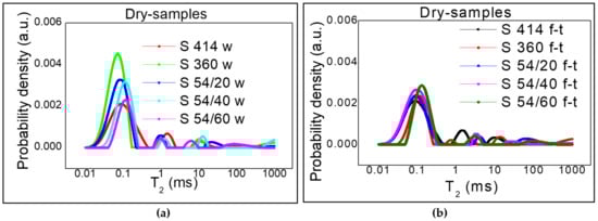 Distribution of the transverse relaxation time T2 after drying: (a) control samples kept in water (w); (b) samples subjected to 300 freeze–thaw cycles (f-t).
