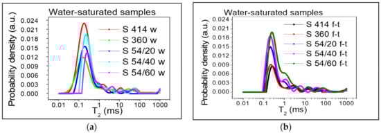 Distribution of the transverse relaxation time T2 after water saturation: (a) control samples kept in water (w); (b) samples subjected to 300 freeze–thaw cycles (f-t).