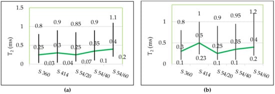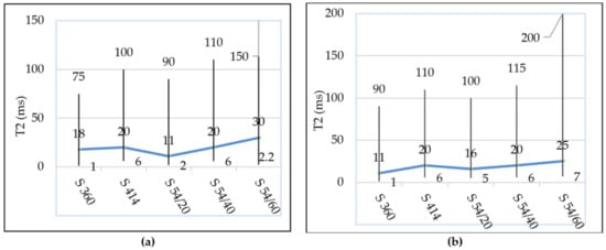 The pore distribution continues with several lower intensity peaks, which correspond to capillary pores, cracks or are artefacts of the numerical inverse Laplace. In the control samples (Figure 5a) the distribution of the transverse relaxation times was within the range 0.03–1.10 ms and for the mixtures tested for freeze–thaw (Figure 5b) the peak shift to the right was recorded at higher values, in the range 0.1–1.20 ms, as can be observed in Figure 6, which shows the starting and ending values for T2 in each mixture corresponding to the gel pores as well as the position of the maximum (a.u.) (broken line).