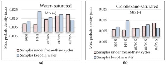 Figure 7a shows the maximum probability density recorded in both control samples kept in water (w) and in samples tested in water-saturated freeze–thaw (f-t). For the water-saturated control samples (Figure 7a), the maximum probability density with the highest value was registered in the mixture S 414 (of 0.023) and the lowest value (of 0.012) was obtained in the mixture S 360. In all blast furnace slag mixtures, the maximum probability density value corresponding to the gel pores is higher than the reference mixture S 360, but lower than in the control mixture S 414. For all water-saturated samples tested at 300 freeze–thaw cycles (Figure 7a), it was observed that the maximum value of the probability density corresponding to the peak of the gel pores increases with the increase in the percentage of substitution with blast furnace slag aggregate and it is above the level in the control mixtures S 360 and S 414. The largest difference in the maximum value of the probability density compared to the control sample was recorded in the mixture S 54/60 maintained at freeze–thaw.