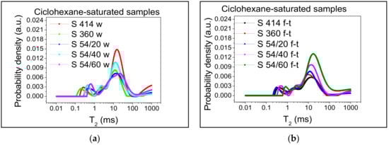Transverse relaxation time distribution T2 after cyclohexane saturation: (a) control samples kept in water (w); (b) samples subject to 300 freeze–thaw cycles (f-t).
