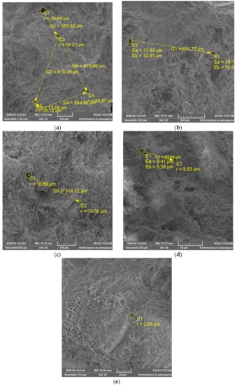 Small pieces of samples were taken from the interior part of the crushed samples and analyzed at room temperature using a VEGA3 SBU electronic microscope with an Energy Dispersive Spectrometer Quantax EDS from Bruker in order to obtain information about the pore’s sizes and the distance between the pores. Fragments from the 150 mm side cubes remaining after the NMR measurements were used from the control sample set, which was kept in water during the freeze–thaw test.