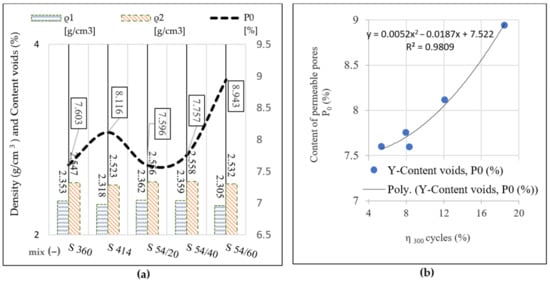 Analyzing the results from Table 6, it is observed that the compressive strengths determined on the control specimens have a similar evolution with the results of the densities presented in Figure 11a. Furthermore, the value of compressive strength losses after 300 freeze–thaw cycles tends to evolve similarly to that of the permeable pore content and develops a second order polynomial relation having a very good correlation coefficient (R value), shown in the diagram in Figure 11b.