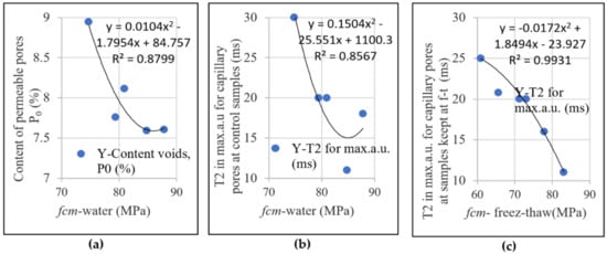 In Figure 12, it is observed that the compressive strengths determined on the control specimens and on specimens maintained at 300 freeze–thaw cycles maintain their evolution trend with the content of permeable pores (Figure 12a) with the relative size of the capillary pores evaluated by NMR technique (Figure 12b,c). With the reduction in the content of permeable pores (P0) and the transverse relaxation time (T2), for which the probability density (au) recorded the maximum value (broken line in Figure 9a,b), the result is the increase in mechanical strengths. The polynomial relation of order two, derived by regression, developed between the compressive strength and the content of permeable pores and the relative size of the capillary pores determined on the control samples, possesses a value of the correlation coefficient very close to 0.8779 and 0.8567 (Figure 12a,b), which confirms the concordance results obtained by standard methods and NMR technique. Moreover, the confirmation of the results obtained by the NMR technique can be appreciated from the correlation coefficient 0.9931 (having the standard error of only 6.9 × 10−3) obtained from the polynomial relationship developed between the compressive strength and the transverse-room relaxation time (T2) for the maximum (a.u.) capillary pores and are measured on samples maintained at 300 freeze–thaw cycles (Figure 12c).