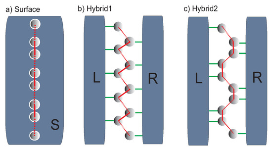 Hybrid systems under consideration are shown in Figure 1. In the simplest case there is a straight SSH chain on 2D electrode (panel a). The surface is described by the tight-binding Hamiltonian for a regular atomic lattice (e.g., rectangular or hexagonal) which leads to the effective surface DOS with the van Hove singularities (see Appendix A). The hybrid systems (Hybrid1 and Hybrid2) are depicted in panels (b) and (c) in Figure 1, where a zig-zag (or armchair edge) SSH chain is placed between two 2D electrodes. In this case, the electronic structure of the chain is influenced by two different electron reservoirs (hybrid structures) which is the central point of studies prested in this paper.
