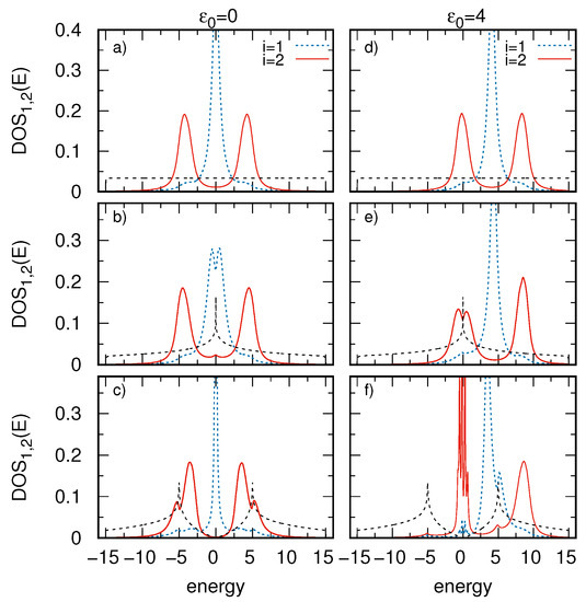 thus the knowledge of Γ ( E ) which depends in the substrate DOS structure allows one to determine all other functions. Moreover, it is also possible to predict the appearance of localized states in the system. These states are observed for vanishing Γ ( E ) (outside the surface band) and they appear for minimal value of E ε 0 Λ ( E ) , i.e., for E ε 0 = Λ ( E ) . In this case, Λ ( E ) function renormalizes the on-site energy position leading to the localized state outside the substrate DOS. It can be shown graphically in Figure A1, where Λ ( E ) , Γ ( E ) and E ε 0 functions for a rectangular lead DOS are analysed.