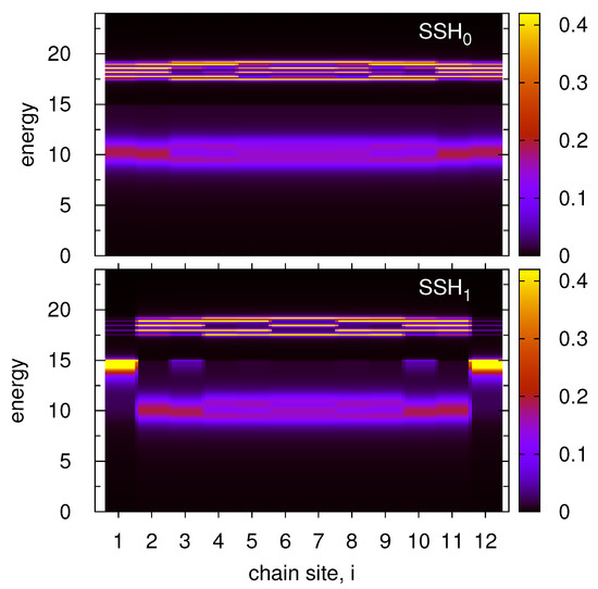 It was shown that local dips in the structure of the substrate DOS strongly modify electronic properties of the SSH chain for symmetrical as well as asymmetrical cases (i.e., for different positions of the chain on-site energies, ε 0 ). However, for larger ε 0 or for relatively narrow surface band the chain on-site energies can lie in the vicinity of the substrate DOS boundaries or even beyond the band. In such a case one expects localized states in the system (like for an adatom on the surface [50]) and significant changes in the chain DOS structure can appear. Thus, it is desirable to study this effect for topologically trivial and nontrivial SSH chains on a surface. The corresponding results are depicted in Figure 3 for both chains, SSH0 (upper panel) and SSH1 (bottom panel) in the form of heatmaps of the local DOS along the whole chain, i.e., at each chain site, i = 1 , . . . , 12 . The position of ε 0 is very close to the surface DOS boundary, ε 0 = 14 , such that the bottom sideband of the SSH chain lies inside the surface DOS and the second one is outside this band. For the trivial SSH chain (upper panel) the boundary of the surface DOS ( E = 15 ) corresponds to the chain energy gap and there are still two sidebands of the chain DOS (inside and outside the surface band). The lower sideband is quite smooth (like the sidebands in Figure 2, upper panels) as its energy lies inside the surface band. On the other hand, the outside sideband is characterized by very sharp and high DOS peaks as in this case there are no corresponding energy states in the substrate and the effective coupling Γ ( E ) = 0 for E > 15 . Thus, outside the substrate band the chain states tend to atomic limit and strong asymmetry of the local DOS appears (as a function of the energy). For nontrivial SSH1 chain (bottom panel) both chain sidebands are also nonsymmetrical and they behave in the same way as for the SSH0 chain. However, at both edge sites, i = 1 and i = N , there exist topological states and as one can see for E > 15 (outside the substrate band) these states suddenly disappear and no extra states are observed above this energy. In this case, the structure of topological state becomes asymmetrical and this interesting effect is going to be studied in more details.