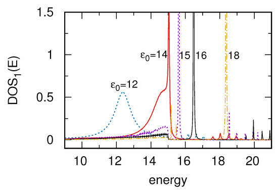 Figure 4. Local DOS at the first site of the SSH1 chain on a surface described by a rectangular DOS (the same as in Figure 2, upper panels) for different values of the chain on-site energy, ε 0 = 12 , 14 , 15 , 16 and 18, respectively. The SSH1 couplings are V = 1 , W = 4 .