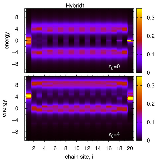 Figure 5. Heatmap plots of the energy and site dependent local DOS along the whole zig-zag chain for the Hybrid1 system (see panel b in Figure 1) for the on-site energies ε 0 = 0 (upper panel) and for ε 0 = 4 (bottom panel). The left (right) 2D electrode is described by DOS with one van Hove (two van Hove) singularity and the chain length is N = 20 sites, V = 1 , W = 4 .