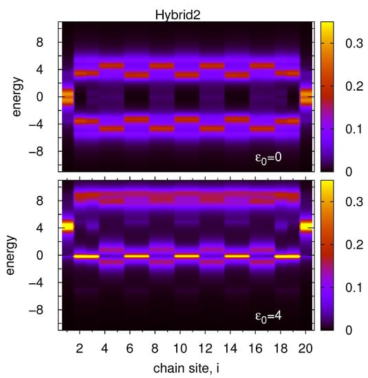 Let us first assume a simple zig-zag SSH chain which sites are coupled alternately with the left or right electrodes (so called Hybrid1 system, Figure 1, panel b). It is analysed the energy dependent local DOS at each chain site along the whole chain ( N = 20 ) for the symmetrical case (Figure 5, upper panel) and for ε 0 = 4 (Figure 5, bottom panel). In this system every odd chain site is coupled with an electrode characterized by a single van Hove peak in the middle of the band. Thus, for the first atomic chain the nontrivial state is relatively wide with small local minimum appearing for E = 0 —the same effect was discussed in Figure 2 panel b. On the other hand, every even number of atom in the chain is coupled with a honeycomb lattice electrode characterized by two van Hove peaks and minimum value of DOS in the middle of the band, thus the edge topological state at the last site, i = 20 , becomes narrower and higher (as was discussed in Figure 2, panel c). However, this state has some effective dispersion as it is coupled via the last but one site (and also other sites) with the left electrode for which there is a finite value of DOS at the Fermi level. It is also interesting that every second site in the SSH1 chain is characterized by small but nonzero DOS in the energy gap region. This effect is known in the SSH chains where topological states appear mainly at both chain ends but they also symmetrically leak inside the chain with decreasing intensities [29,46]. Here one can observe asymmetrical values of DOS along the chain. It is a consequence of much higher topological state at the last site i = 20 in comparison with the first site DOS, which allows for deeper penetration of this state into the chain. As an unexpected result it was found that nonzero local DOS at the Fermi level in the chain is observed for these sites which are directly coupled with the right electrode (which has no states at the Fermi energy).