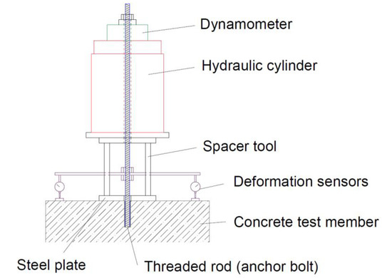 To measure deformations, there should be at least two displacement sensors applied between the steel specimen body and the anchor bolt. The measuring range should be at least 0–10 mm with an accuracy at least 0.001 mm. The applied force is measured by a dynamometer with an internal hole for the passage of a threaded rod. The minimum rated load of the dynamometer is 200 kN with an accuracy of 0.01 kN.