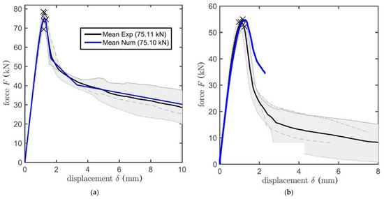 The numerical model presented in [25] fits the post-peak behaviour of the anchor very well. The model uses the elastic response defined by the damage stiffness parameter depending on the slippage. The post-peak behaviour is defined by multilinear softening. The comparison of the numerical model and the results of the deformation-controlled confined and unconfined tests are shown in Figure 3a,b. The parameters of these anchors were: d = 12 mm, hef = 90 mm, τ = 22.15 MPa and fc = 25.96 MPa.
