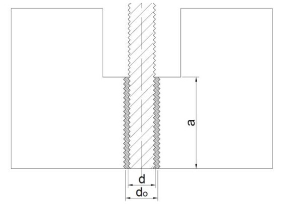A new steel test specimen was designed; Figure 6. This test specimen may be made of common-strength steel. This specific steel specimen was designed to test M12 diameter bolts and was equipped with an M18 internal thread. This solution ensures an even layer of anchoring material with a thickness of at least 1.3 mm. The thickness of this layer varies depending on the change in the geometry of both threads. Due to the material properties of steel, it can be assumed that during the test, the fault always occurs in the layer of the adhesive, usually in contact with the outer edge of the thread of the anchor bolt. The steel specimen was designed to test anchor bolts anchored to a length equal to four or five times the anchor bolt diameter. The anchorage length can be regulated by exchanging the sealing screw with a different length.