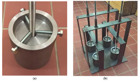 (a) Steel test specimen with the locking screws; (b) Four steel test specimens in mounting jig keeping anchor bolts in the exact vertical positions.