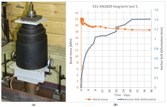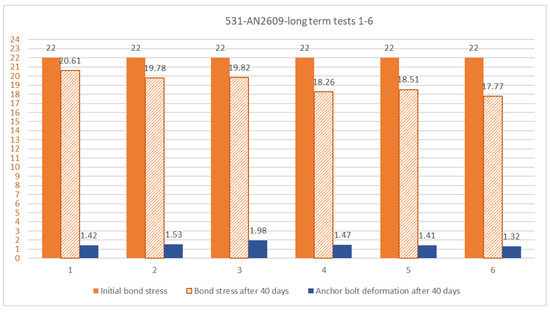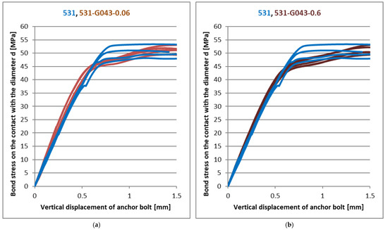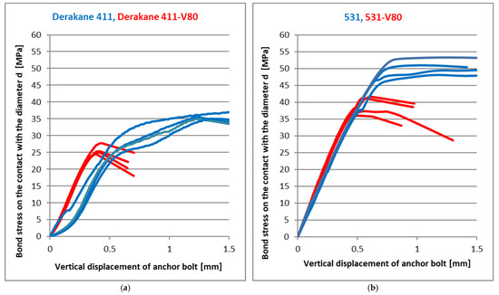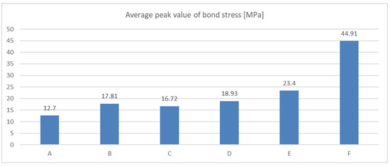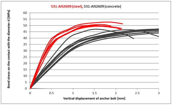 The parameter entering into the calculation of the load-bearing capacity of the glued anchor according to [1,6,12] is the bond strength between the anchor bolt and the base material, which is mediated by the adhesive. The mechanism of failure may generally vary according to the stress distribution and the position and the shape of the failure. The failure can occur at both interfaces, concrete–adhesive or adhesive–anchor, or even inside the adhesive layer itself [37]. The bond strength value determined by the test according to Figure 1 may not be directly related to a specific type of failure. It is a parameter calculated from the applied force and the anchor geometry.