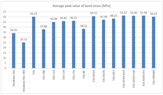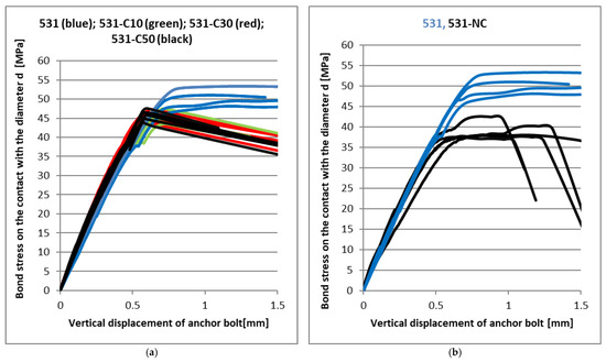 This implies that failure on this contact is not the problem of pure adhesion. Thanks to the articulation of the contact and the interconnection of materials, there are local shear-stressed surfaces on the interface. The final contact failure is determined mainly by the shear strength of the individual materials. Depending on what concrete is used and what adhesive is used, each of these materials contributes to the failure to a different extent. This fact can lead to a combined failure of the concrete and the adhesive [17,18].