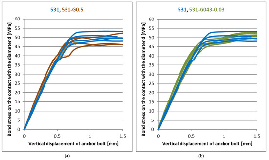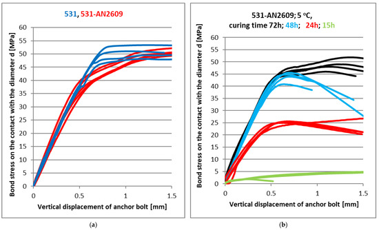 where τmax is the peak value of shear stress near the top edge of the anchor bolt, and the value λ’ is the elastic constant, which depends on the shear stiffness of the adhesive–concrete system and the axial stiffness of the anchor. The bond stress model is more often defined for the interface between the steel anchor bolt and the adhesive (mortar) using the diameter d of the anchor bolt in design standards [7,15,16] such as (4). The bond stress, in this case, has to be defined on the same interface.