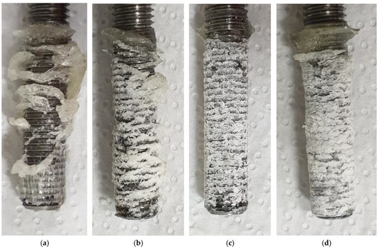 The value of the bond strength is, in fact, the peak value of tangential stress measured on the contact area. This contact area is given by the anchor bolt diameter and the anchorage length. In ETAG 001 [7], the diameter of the anchor bolt itself is used. However, the real failure occurs on the interface between the steel and the adhesive only when the adhesive is the material with the lowest strength characteristic [19]. In common-strength concrete, failure usually occurs on the interface between the adhesive and the concrete. The thickness of the adhesive layer for the most widespread adhesive anchor systems is usually between 1 to 2 mm. This means that in common cases, it is acceptable to simplify the solution this way. As it is shown in Figure 2a,b, the surface of the concrete after drilling is quite rough (considering the use of a hammer drill).