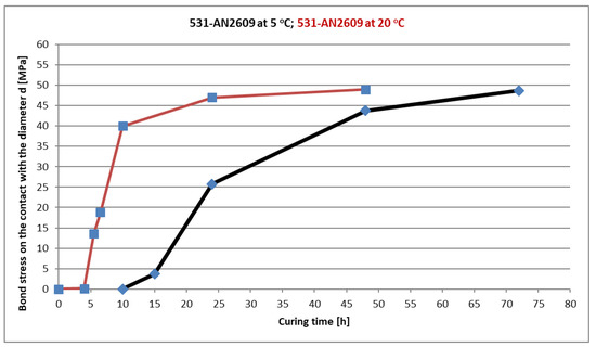 Epoxy resins are often used as adhesives due to their excellent mechanical and physical properties, high adhesion, thermal stability, low shrinkage and resistance to solvents. With regard to the goal of achieving the highest possible values of mechanical properties, especially shear strength, epoxy resins were used in this analysis. In addition, specific fillers were added to the epoxies to improve their properties [26,27]. These fillers are often used because they are able to influence many physical and mechanical properties due to their structure and various surface modifications. Frequently investigated fillers are titanium dioxide [28], graphene oxide [29,30], carbon nanotubes [31,32], nanoclay [33], carbon fibres [34], etc. or even combinations thereof. The main disadvantage of common epoxy resin is the problem of curing at low-temperature conditions. The curing of standard epoxy resins does not take place at temperatures below 15 °C. In order to use the epoxy-resin-based adhesive in the construction industry, it is necessary to ensure the ability to form glued bond even during colder periods, when temperatures are between 5 and 10 °C. Processes such as gelation and vitrification are controlled by the temperature and curing time [35].