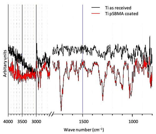 FTIR transmission spectra of a titanium surface in the as-received state and after pSBMA coating.