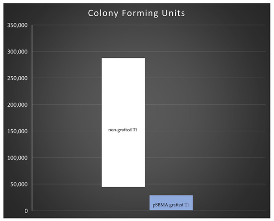 The statistical comparison of CFU between pSBMA grafted titanium and non-grafted titanium plates showed that the bacterial colonization on non-grafted plates was significantly higher compared to SPE grafted titanium surfaces (p = 0.021) (Figure 7).