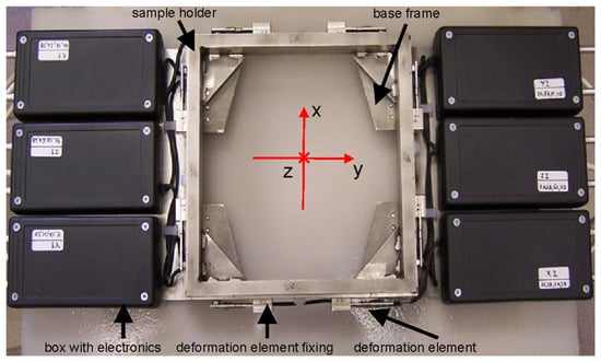 The AWJ cutting forces are measured through a patented force sensor []. The whole device consists of the frame with deformation elements, the sample holder frame and the electronics separated into six plastic boxes. Each of these boxes includes the amplifier of the electric signals raised from the strain gauges in the respective direction. These gauges are pasted on the deformation elements mounted on the main measuring frame and touching the sample holder frame via pointing bits. The overall design is shown in Figure 1. The force-measuring device is located horizontally with respect to the Earth’s surface, and the AWJ is flowing vertically.