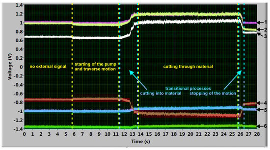 The signals were measured using the software Signal Express 2012 and it is evaluated in software LabVIEW 12 (Version 12, 2012), both supplied by the National Instruments Corp., Austin, TX, USA). An example of the typical voltage signals measured with tilted cutting head is shown in Figure 3.