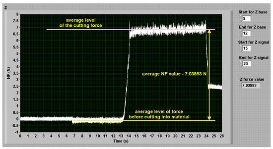 The used processing starts by selecting of the respective parts of the signal for the force value determining. A part of the signal level with the switched pump and the traverse movement, but prior cutting into material, forms the base level (see the part “starting of the pump and traverse motion” in Figure 3). A part of the signal corresponding to the stable cutting through material (with the exception of the initial transitional process corresponding to the cutting into material and the final transitional process corresponding to the jet traverse movement stopping) forms the level of the respective force during machining (the part “cutting through material” in Figure 3). Both parts of the signal (selected for calculations) should be at least two seconds long. The respective average values of force levels are calculated from both parts of the signal (Figure 4) and their difference is considered to be the force value in the respective axis. The total NF value is the sum of partial signals 1 and 2 in Figure 3. The selection of the signal parts and respective calculation of the force values is a part of the signal processing programmed in the LabVIEW (Figure 4). The respective calibration equations were determined by using normalized weights. The respective equations are implemented into the LabVIEW programs for signal processing.