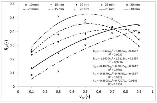 Tangential-to-normal (Fx–Fz) force ratio (RH) for the material thickness (H), depending on the (i.e., -to- ratio): data from Table 3; the regression equations are calculated in Excel®.