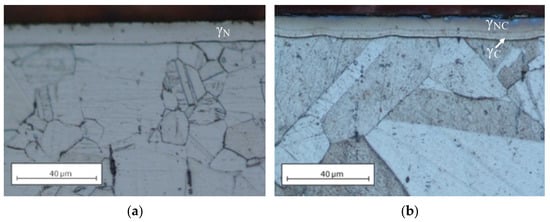 Figure 1 presents the microstructures of the nitrided and nitrocarburised layer. The layer formed in this temperature consisted of expanded austenite, which is evidenced by XRD examinations (Figure 2). In the case of the nitrided layer, a homogeneous structure of γN can be observed with a clear, sharp front approx. 9.7 μm deep (Figure 1a). In turn, the nitrocarburised layer showed a dual-layer structure comprising two layers of γNC and γC separated by a clear border, with a total thickness of 10.5 μm, where γNC measured 7 μm, while γC–3.5 μm (Figure 1b). The outer, larger part of the layer consisted mainly of nitrogen S-phase while on the inside it was mainly softer carbon S-phase (Figure 2), making it thus a gradient structure.