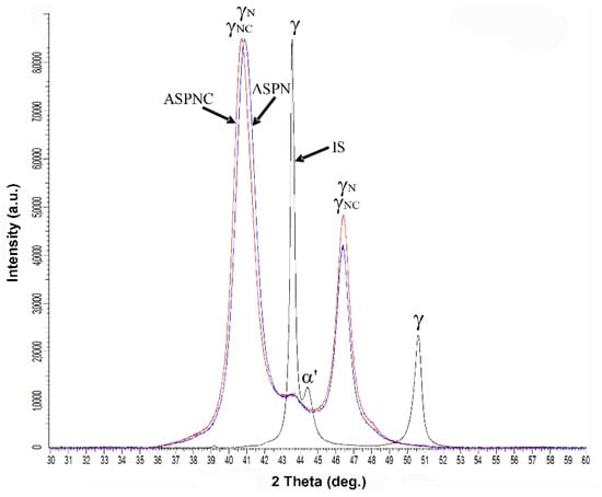 XRD patterns for AISI 316L austenitic steel in its initial state (IS) and after ASPN and ASPNC; γ—austenite, γN—nitrogen S-phase, γNC—nitro-carbon S-phase, α′—deformation martensite.