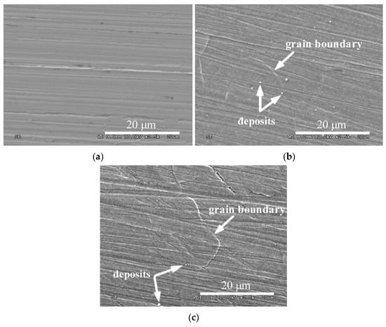 Figure 3 shows the surfaces of austenitic steel in its initial state and after ASPN and ASPNC. An increase in surface development is observed following the glow discharge treatments. Changes in the topography of the steel surfaces stem mainly from the processes that occurred at the grain boundaries. During SEM observations, deformation in the vicinity of the boundaries was observed, which resulted from the significant stress that had accumulated during the anisotropic diffusive supersaturation of grains with different crystallographic orientations. This process led to different degrees of expansion of the neighbouring grains (Figure 3b,c) and manifested itself by a relief visible on the steel surface [], which was not observed in the case of steel in its initial state (Figure 3a). The relief was more noticeable on the surface of the nitrocarburised layer, which can be associated with greater lattice expansion (Table 1) and the associated higher residual stress []. The changes observed at the grain boundaries could also be indicative of intercrystalline cracking in the S-phase, however, no propagation of cracks from the surface on the cross-section in the microscopic tests was observed. Very small deposits were also observed on the surface of the layers, which were applied to the sample surfaces by way of cathodic sputtering of the active screen (Figure 3b,c). To some extent, they also contributed to an increase in surface roughness after the ASPN and ASPNC processes. However, the particles did not form a compact, continuous layer of iron or chromium nitrides (Figure 1 and Figure 2), which could hinder the diffusion of nitrogen and carbon in the surface layer of steel [,].