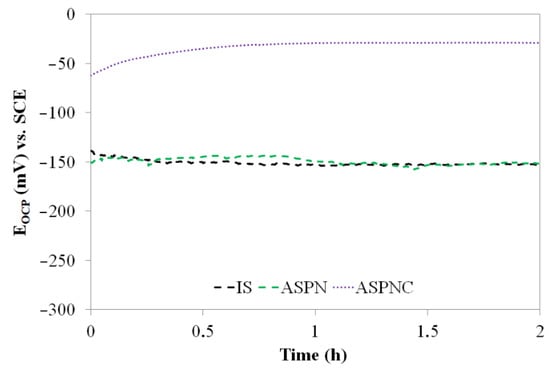 OCP (open circuit potential) curves of AISI 316L steel in its initial state (IS) and after ASPN and ASPNC; SCE—saturated calomel electrode.