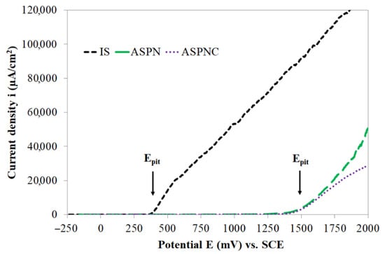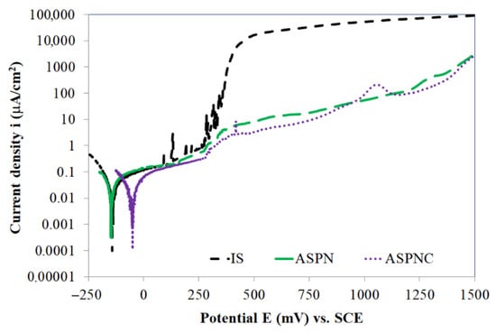 Anodic polarisation curves (up to 2000 mV) of AISI 316L steel in its initial state (IS), after ASPN and ASPNC.