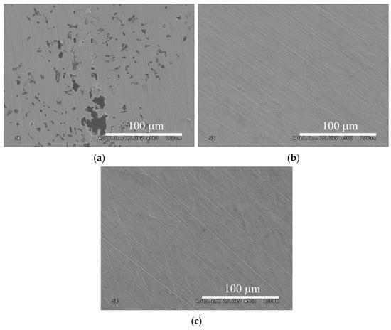 The corrosion resistance of AISI 316L steel at an initial state and after ASPN and ASPNC was measured in a solution of 0.5 M (2.9%) sodium chloride (Chempur, Piekary Śląskie, Poland) with a pH of 7 by means of the potentiodynamic method using an Atlas-Sollich 0531 EU&IA device (Atlas-Sollich, Rębiechowo, Poland). A three-electrode setup was used in the tests comprising a test electrode, a saturated calomel electrode (SCE, Eurosensor, Gliwice, Poland), i.e., the reference electrode and a platinum gauze as a counter electrode. Before the tests, the samples were kept in the measurement array for 2 h to stabilise open circuit potential (OCP). Afterward, the polarisation resistance Rpol was gained via the Stern method by polarising the test material from a potential of 10 mV lower to 10 mV higher than the determined OCP at a sweep rate of 0.2 mV·s−1. The polarisation resistance was determined on the basis of the E = f(i) dependence. The anodic polarisation curves of the tested materials were then registered via the potentiodynamic method. The samples were polarised from a potential 0.2 V lower than the OCP, to a potential of 1.5 and 2 V. In the potential range of ±200 mV from the OCP, a polarisation rate of 0.2 mV·s−1 was used, whereas in the remaining potential range the rate was 0.8 mV/s. Pitting potentials Epit and the anode current densities in the passive layer range ipas were evaluated from the polarisation curves. The corrosion current density icorr and corrosion potential Ecorr were determined using the Tafel extrapolation method. All of the corrosion tests were performed three times to verify reproducibility. After potentiodynamic tests, the samples’ surfaces were observed again using a Hitachi S-3500N SEM (Hitachi, Tokyo, Japan).