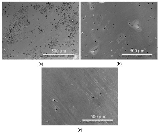 A large number of small pits, which formed from a potential of 355 to 2000 mV, are observed on the surface of AISI 316L steel (Figure 8a). In the case of the ASPN layer, there were much fewer pits (Figure 8b) than on the surface of the steel in its initial state, which was due to a pitting potential close to 1500 mV. A significantly slower increase in corrosion current density following nitrocarburising suggests a slower expansion of the pits, as observed by the decreased number of pits formed after corrosion tests (Figure 8c) as compared to the nitrided layer (Figure 8b).