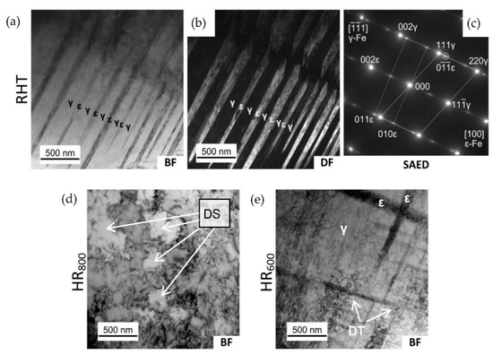 To clarify the peculiarities of the dislocation substructure in the RHT state and after various treatments, a TEM study was performed after RHT, HR600, and HR800 regimes. Corresponding bright field (BF) and dark field (DF) images are presented in Figure 2. The bright field image of the structure formed after RHT shows a colony of parallel elongated dark crystals in a matrix that did not contain a high dislocation density (Figure 2a). The corresponding selected area electron diffraction (SAED) pattern consists of FCC γ-austenite matrix reflexes belonging to the <100>γ zone axis and some reflexes of HCP ε-martensite (Figure 2b). The DF image of the same area presented in Figure 2c was taken from the 0ε reflex shows that the elongated crystals became bright, and thus, these crystals represent ε-martensite.