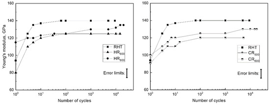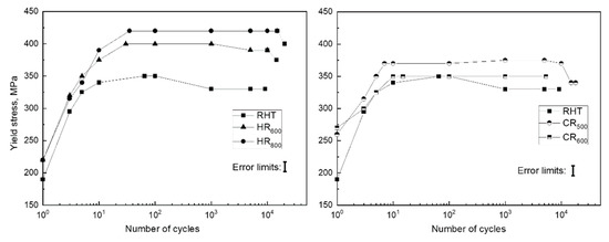 It can be seen from Figure 3 and Figure 4 that for all studied regimes, the values of the dislocation yield stress increase with the growing number of cycles. The values of the dislocation yield stress for different regimes increase within the following limits: RHT-200–330 MPa, HR600-200–400 MPa, HR800-200–400 MPa, CR500-220–375 MPa, and CR600-230–360 MPa. Therefore, in the first cycle, the dislocation yield stress after RHT and HR600 and HR800 does not differ. It takes place because, in the case of RHT, the alloy contains a more significant amount of ε-martensite compared to TMT [24], which compensates for the absence of strain hardening after RHT.
